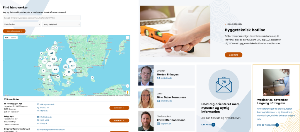 Samtidig har vi opbygget et avanceret søgeværktøj, der gør det muligt for eksterne brugere at finde en håndværker med garantiordning i deres lokalområde – med filtrering efter geografi og branche. Et vigtigt redskab i Dansk Håndværks arbejde med at styrke medlemmernes synlighed.